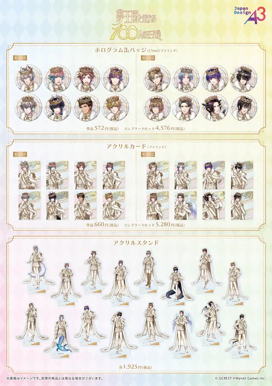 <公式ビジュアル 10周年Ver.王子様> ■ホログラム缶バッジ【セット1】(全8種/ブラインド) ■ホログラム缶バッジ【セット2】(全8種/ブラインド) ■アクリルカード【セット1】(全8種/ブラインド) ■アクリルカード【セット2】(全8種/ブラインド) ■アクリルスタンド(全16種) ■アクリルスタンドプレート(全8種) ■キャンバスボード(全4種) ■小物ケース(全4種) |