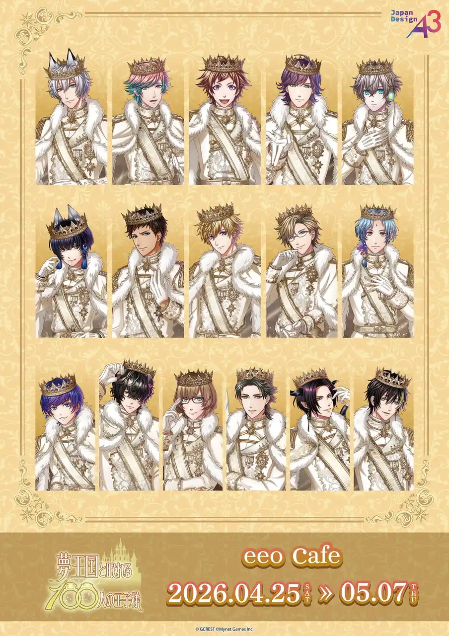 大人気スマホゲームアプリ『夢王国と眠れる100人の王子様』(略称:『夢100』)のコラボカフェが、2026年4月25日(土)から5月7日(木)にかけてeeo Cafeにて開催決定! あわせて新作グッズも多数登場し、3月18日(水)からは通販サイト「eeo Store online」でもお取り扱い中です。 |