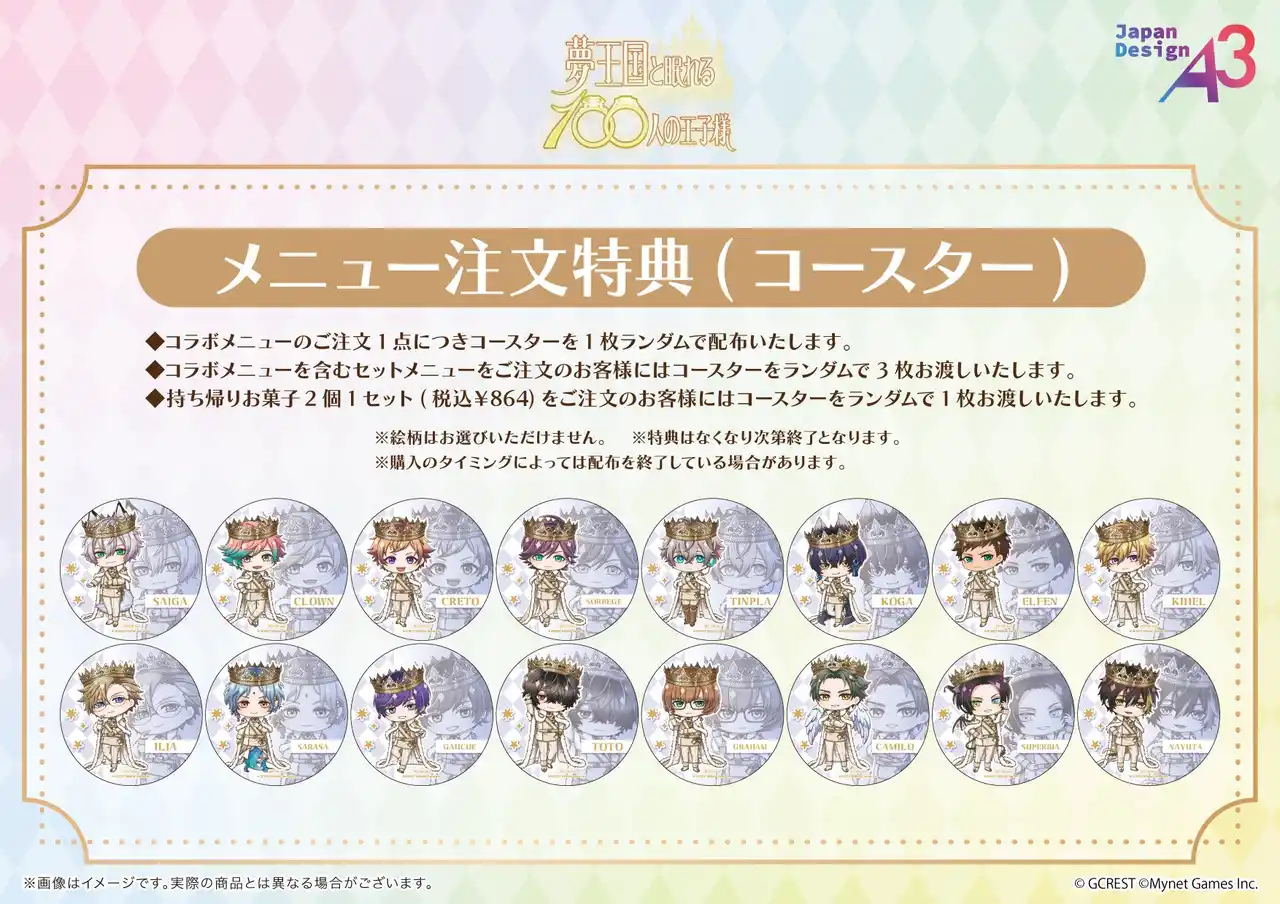 【配布条件】 ■コラボメニューのご注文1点につき、コースターを1枚ランダムで配布 ■コラボメニューを含むセットメニューをご注文の方には、コースターを3枚ランダムで配布 ■お持ち帰りお菓子2個1セット(税込864円)をご注文の方には、コースターを1枚ランダムで配布 |