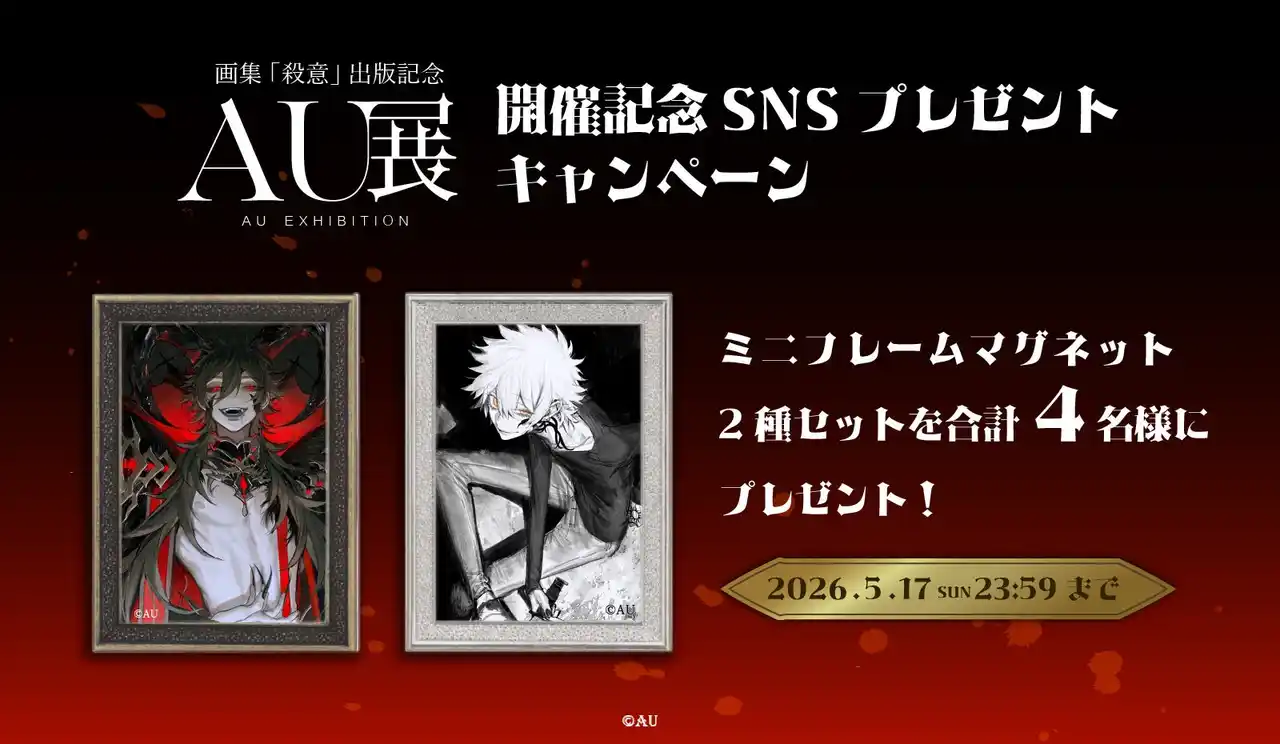 会場では、画集『殺意』の先行販売を行うほか、直筆サイン入りの88グラフ(版画)や記念グッズを販売。さらにAU氏による初のサイン会も開催予定です。 |