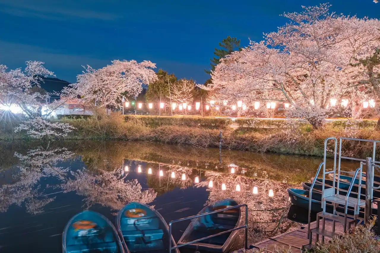 開花期間中は、ぼんぼりが点灯され、夜桜見物を楽しめるほか、堀に映る桜も見事です。辺りは幻想的な雰囲気に包まれます。 |