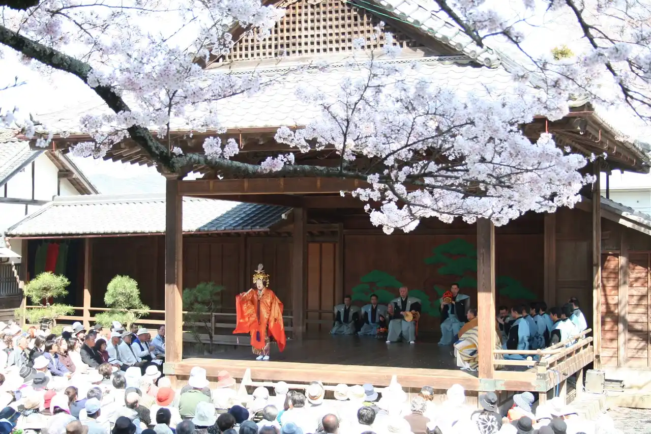 毎年、4月の第2土曜日(2026年は4月11日)にはこの能舞台で能と狂言が披露されます。(要観覧チケット)花吹雪の中、幽玄な世界をお楽しみいただけます。 |