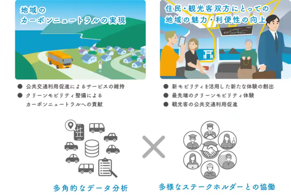 本連携では、糸島半島エリアが抱える交通課題の解決と、カーボンニュートラルの実現を目指し、官民および学術機関が一体となって取り組み、様々なデータ分析を活用しつつ地域の特性やニーズに即したモビリティの在り方の検討を進めます。公共交通の利用促進につながる行動変容策や、クリーンモビリティの導入を通じて、カーボンニュートラルの実現に資する渋滞の解消やサステナブルな公共交通手段の確保の実現と、他の地域に展開できるモデルケースの創出に向け協働していきます。クリーンモビリティについては、糸島半島エリアで既に走行実績のある水素燃料電池バスの運用拡大や、様々なサービスに活用可能なバッテリーEV等の導入を検討します。 |