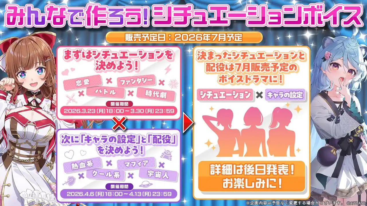 | 投票により決定した5種のシチュエーションを元にミニボイスドラマ化し、2026年7月中を目処に販売いたします! | |||