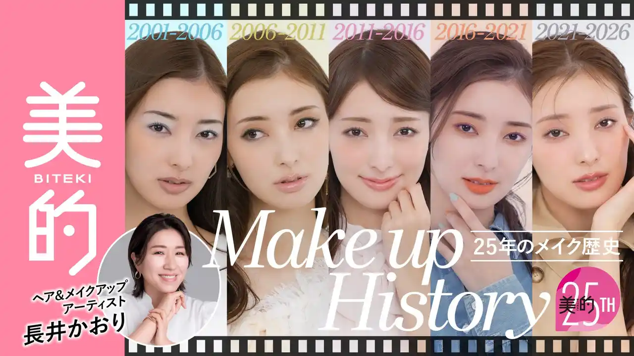 | 第一弾として、『美的』創刊時の2001年から2026年の最旬顔まで、5年ごとのルックをヘア&メイクアップアーティストの長井かおりさんが解説する「Make-up History -25年のメイク歴史-」を公開中⇒https://youtu.be/xtIQVuuyQdc | |||