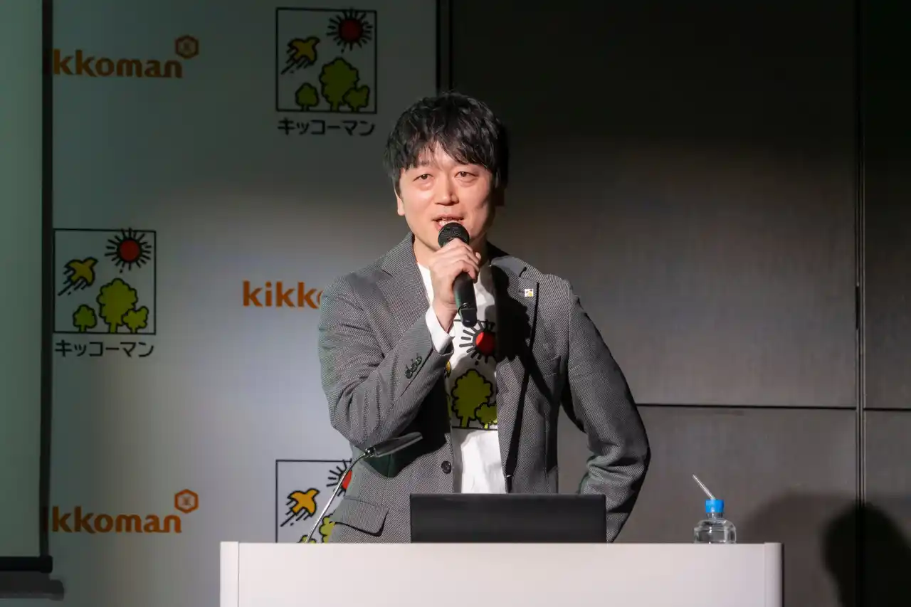 はじめに、キッコーマンソイフーズ株式会社 マーケティング本部 マーケティング推進部長 亀井淳一が2026年度の事業戦略についてプレゼンテーションを実施。近年の健康志向の高まりや、たんぱく質摂取意識の上昇を背景に、豆乳市場は拡大傾向にあり、生産量は過去最高水準に達していることを説明しました。 |