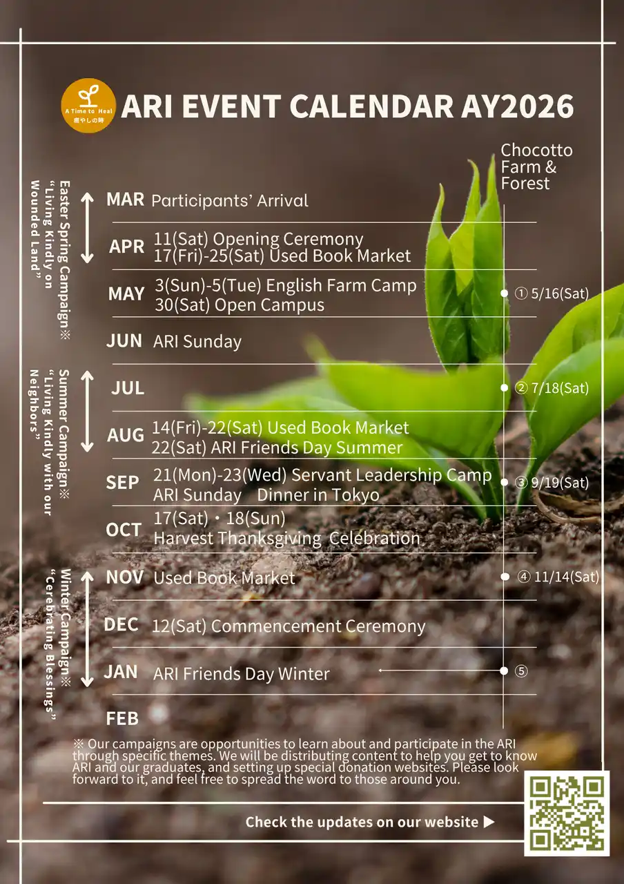 Annual Schedule Highlights March: Arrival of Participants April: 11th (Sat) Opening Ceremony, 17th (Fri) - 25th (Sat) Used Book Market. May: 3rd (Sun) - 5th (Tue) English Farm Camp, 30th (Sat) Open Campus (Campus Tour & Intro to Servant Leadership) June: ARI Sunday August: 14th (Fri) - 22nd (Sat) Used Book Market, 22nd (Sat) ARI Friends Day Summer September: ARI Sunday, Dinner in Tokyo, 21st (Mon) - 23rd (Wed) Servant Leadership Camp October: 17th (Sat) & 18th (Sun) Harvest Thanksgiving Celebration November: Used Book Market December: 12th (Sat) Commencement Ceremony January: ARI Friends Day Winter |