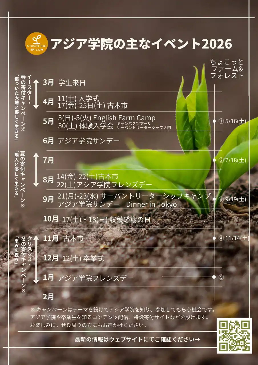 | 年明けに告知したアジア学院の 2026年度の主なイベントスケジュールについて、詳細が決定しましたのでアップデートをご覧ください。 |