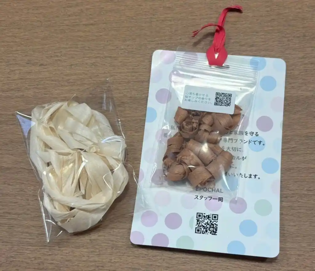 株式会社ピーカブー(ブランド:エポカル)は、地元企業とのコラボレーション企画として、ヒノキのカンナ屑を製品とともにお届けする取り組みを、2026年3月初旬より開始いたしました。 |