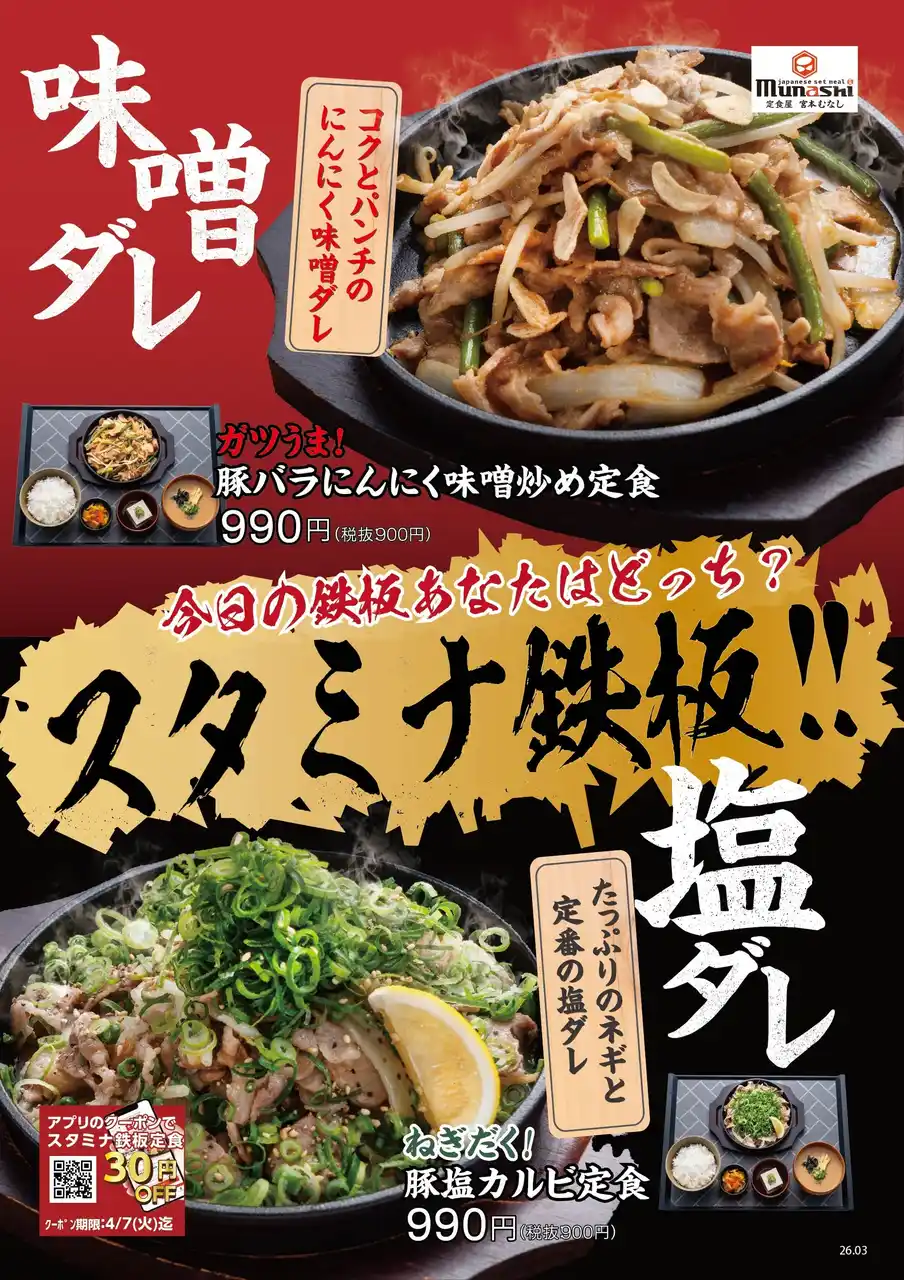 | M&Sフードサービス株式会社(本社:大阪府大阪市、代表取締役執行役員社長:岡本 俊亮)が運営する定食チェーン「定食屋 宮本むなし」では、2026年3月25日(水)より、「スタミナ鉄板フェア」を開催し、「ガツうま!豚バラにんにく味噌炒め定食」「ねぎだく!豚塩カルビ定食」を期間限定で販売いたします。 | ||||||||||||||||