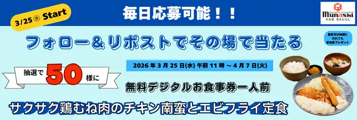 | あわせて2026年3月25日(水)午前11時~2026年4月7日(火)の期間に「宮本むなし公式Xフォロー&リポストキャンペーン」を実施いたします。宮本むなしの公式Xアカウントをフォローし、キャンペーン投稿をリポストすることで期間中毎日応募でき、その場での抽選で定食屋宮本むなし店内で「サクサク鶏むね肉のチキン南蛮と海老フライ定食」(1,250円税込)1人前をお召し上がりいただけるデジタルお食事券が当たるキャンペーンです。ぜひこの機会に宮本むなし公式Xのフォロー&リポストでのご参加をお待ちしております。 | ||||||||||||||||