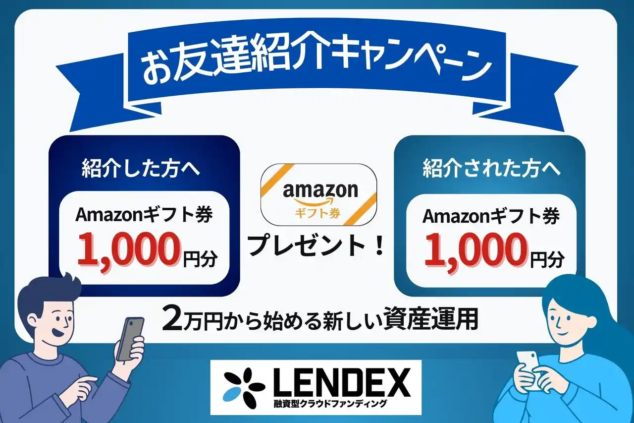 | この度、融資型クラウドファンディング「レンデックス(LENDEX)」を運営する株式会社LENDEX(本社:東京都渋谷区、代表取締役:中村 智)は、本日、2026年3月24日(火)より『Amazonギフト券がもらえる!お友達紹介キャンペーン』を実施いたします。 | |||