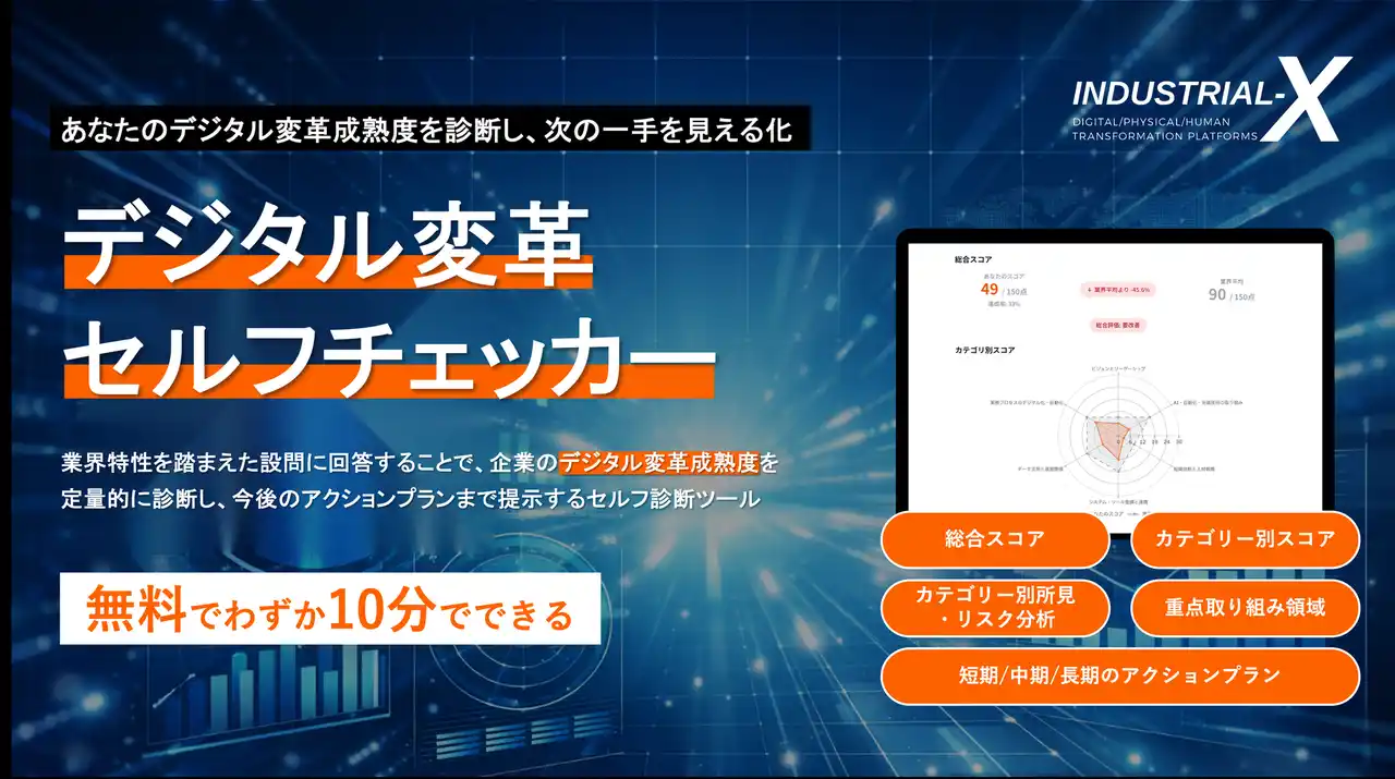 | 株式会社INDUSTRIAL-X(本社:東京都港区、代表取締役CEO:八子 知礼、以下「当社」)は、企業のデジタル変革(DX)およびデータドリブン経営の成熟度を診断できるオンラインツール「デジタル変革セルフチェッカー」をコーポレートサイト上で公開したことをお知らせします。 | |||||||||