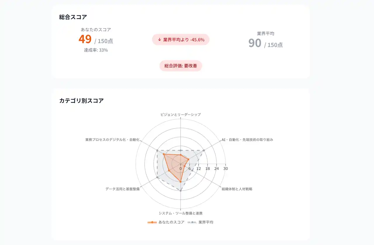 | サービス概要:業界別に最適化された設問に回答することで、デジタル変革成熟度を可視化し、自社の現在地と業界内でのポジションを把握。課題分析から短期・中期・長期の具体的なアクションプランまで提示するセルフ診断ツールです。 | |||||||||