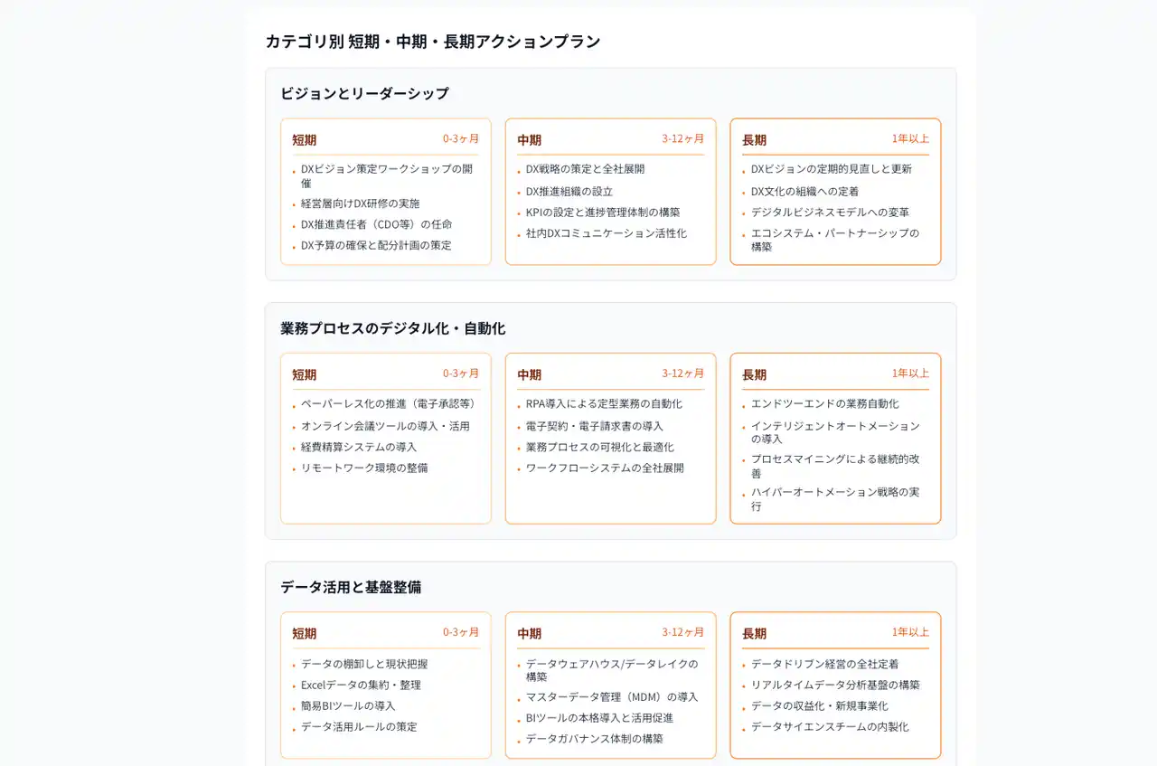 ・具体的なアクションプラン提示 短期・中期・長期の観点で、次に取り組むべき施策を提示 |