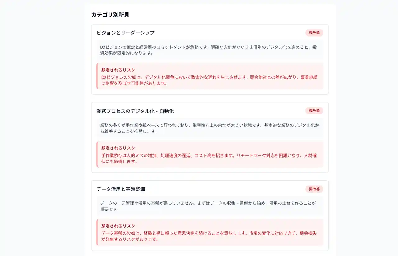 ・総合スコア ・カテゴリー別スコア ・カテゴリー別所見・リスク分析 ・重点取り組み領域 ・短期/中期/長期のアクションプラン |