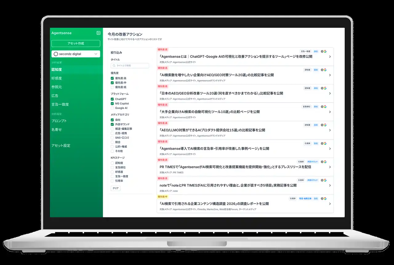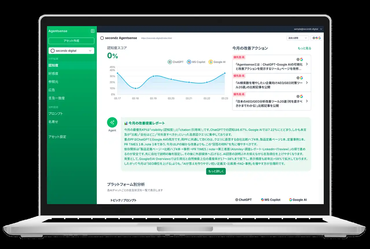 AI検索時代における企業やサービスの見え方を可視化し、改善につなげるAI検索プラットフォーム「secondz Agentsense」を提供しています。生成AI上での認識や参照状況の把握から、改善提案までを支援しています。 |
