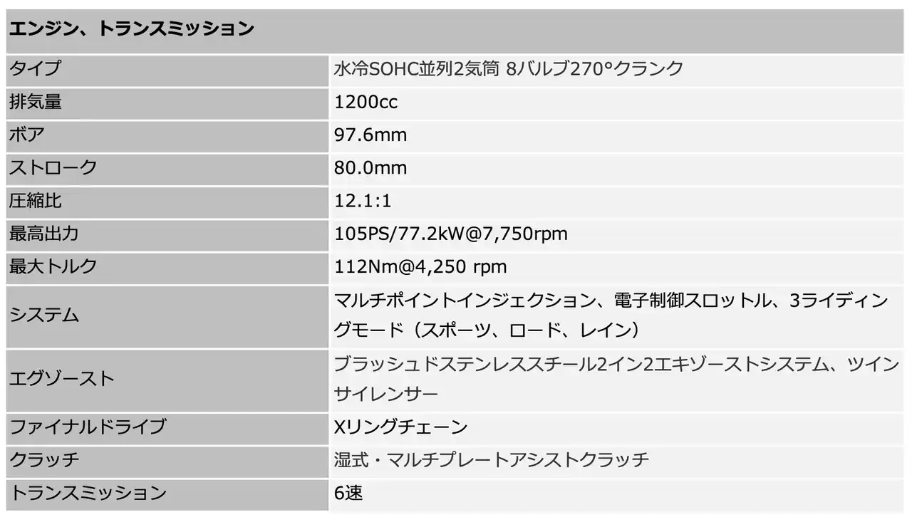 K3タイヤを標準装備し、ダイレクトで一貫性のあるブレーキフィールと高い安心感を提供します。パワーユニットには、トライアンフの高圧縮比Bonneville 1200 バーチカルツインエンジンを搭載。最高出力105PS(7,750rpm)を発揮し、8,000rpmのレブリミットまで力強く持続するパフォーマンスを実現しています。270度クランクによる特徴的な鼓動と、低慣性クランクシャフトの組み合わせにより、鋭いスロットルレスポンスと個性豊かなパワーデリバリーを実現。さらに、全回転域で豊かなトルクを維持し、最大トルク112Nmを発生します。 |