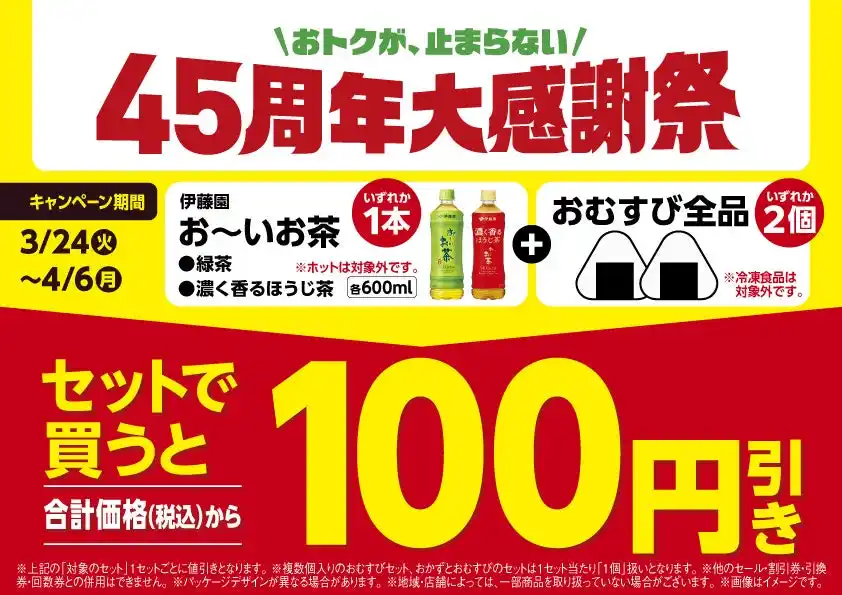今回のキャンペーンでは、2026年3月24日(火)から4月6日(月)まで、おむすびいずれか2個と「お~いお茶 緑茶」もしくは「お~いお茶 濃く香るほうじ茶」いずれか1本をセットで買うと合計価格から100円引きとなるキャンペーンを実施いたします。 |