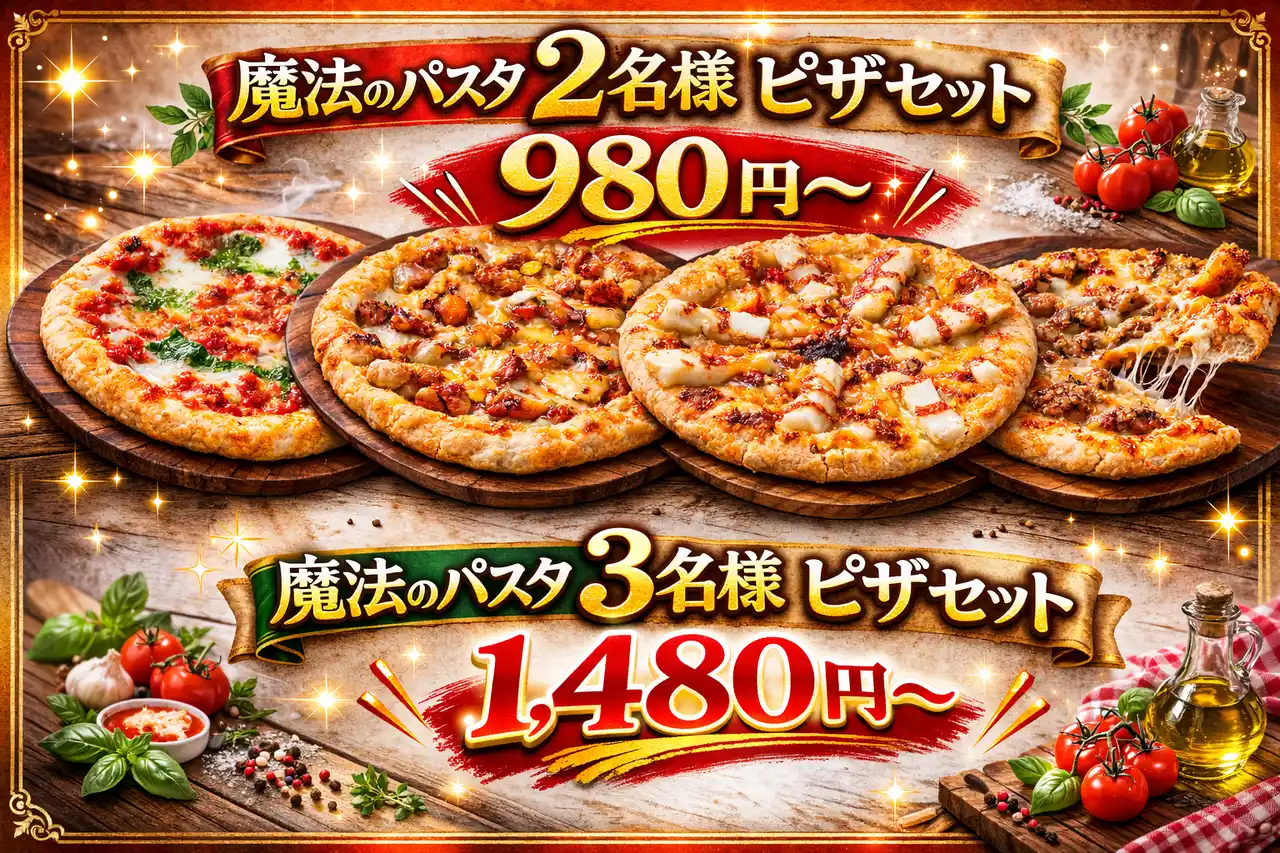 | 魔法のパスタ伊集院店では、お好きな石焼生パスタをご注文いただいたお客様を対象に、2名様ピザセット、3名様ピザセットを追加できます。 | |||