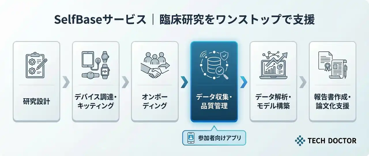 SelfBaseは、ウェアラブルデバイスを活用した臨床研究において、研究設計から運用、データ解析までを一貫して支援するサービスです。 |