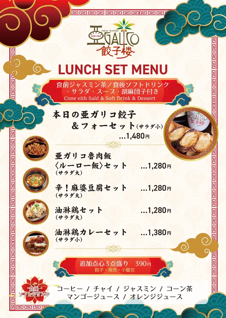 | 手包みの焼餃子は、シンプルだけど奥深い。 定番から、トリュフやパクチーなどの"ちょい攻め"まで、ちょっとした驚きや遊び心を加えた餃子を多数ご用意しています。カウンターに並ぶ点心たち、香ばしい炒飯や麻婆豆腐。昔ながらの味に、ほんの少しのユーモアと新しさを添えて。名物餃子はもちろん、アジア屋台の定番おつまみや〆にうれしい町中華メニュー、遊び心あるドリンクまで。ひとりでも、仲間とでも、いつ来ても"ちょうどいい"。アガリコ餃子楼は、そんな美味しさを集めたお店です。 | ||||||||||||||