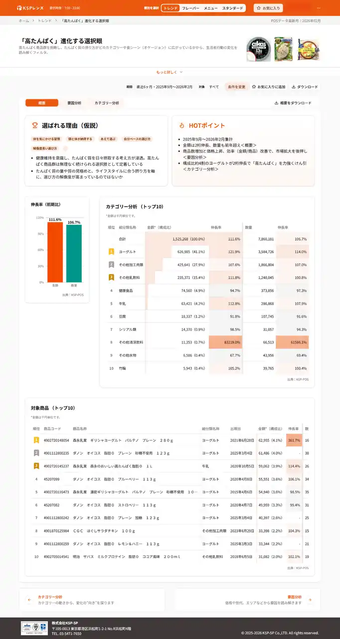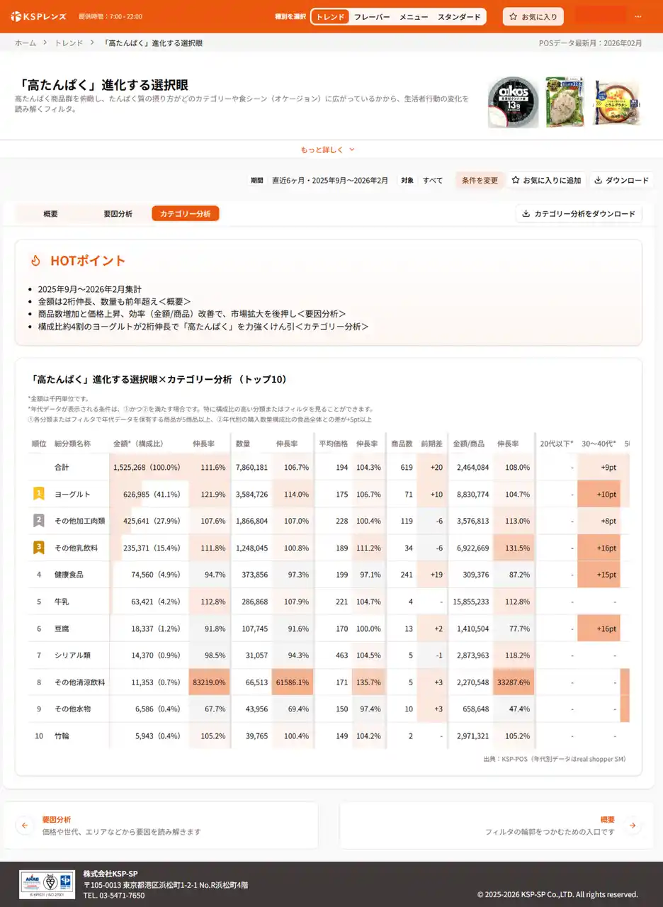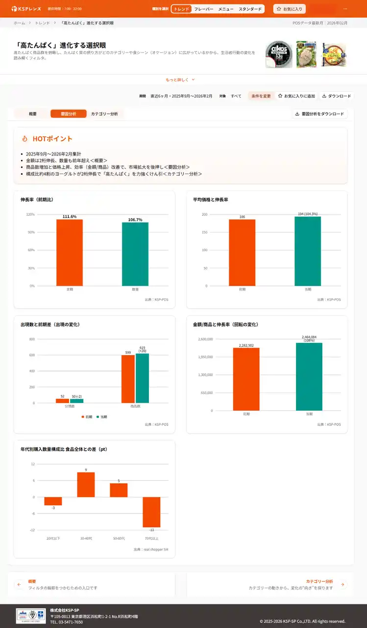 株式会社KSP-SP(本社:東京都)は、食品メーカーをはじめ、商品開発やマーケティングに関わる担当者に向けて、食品POSデータから見えてくる市場の動きを「兆し」として捉え、ヒントを導くための視点サービス「KSPレンズ」を公開しました。 |