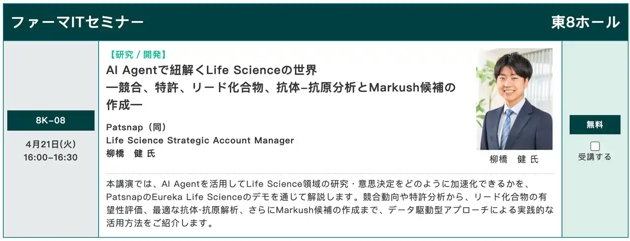 私どものブースでは、創薬研究から承認・市場展開に至るまでのプロセスを一貫して支援するAIエージェント「Patsnap Eureka」をご紹介しております。 また、4月21日(火)16:00~16:30の講演では、AIエージェントの活用によるライフサイエンス領域における研究および意思決定の高度化・迅速化について解説いたします。競合動向・特許分析を起点に、リード化合物の有望性評価、抗体‐抗原解析、さらにはMarkush候補の設計に至るまで、一連の実践的な活用アプローチをご紹介いたします。 ぜひ弊社ブース「8H-10」にお立ち寄りいただき、最新のAIエージェントをご高覧いただけますと幸いです。 |