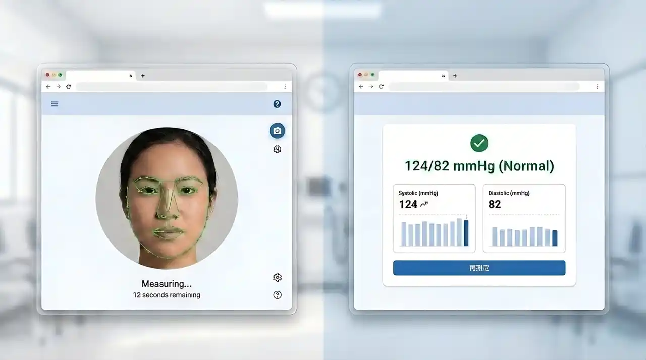 本システムは、特別なセンサーを一切使わず、スマートフォンやPCの標準カメラで顔や皮膚を約15秒間撮影するだけでバイタル情報を可視化します。 |