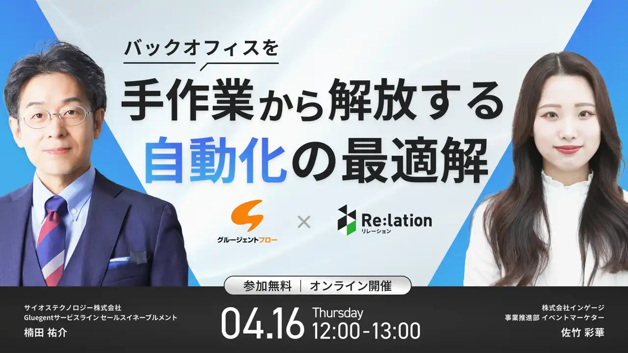| コミュニケーションプラットフォ-ム「Re:lation(リレーション)」を提供し、6,000社以上(※1)の導入実績を誇る株式会社インゲージ(本社:大阪府大阪市、代表取締役社長:和田 哲也、以下インゲージ)は、2026年4月16日(木)、サイオステクノロジー株式会社と共同で、バックオフィス業務の自動化をテーマにした無料ウェビナー「バックオフィスを『手作業から解放』する自動化の最適解」を開催することをお知らせいたします。 | ||||||||||||