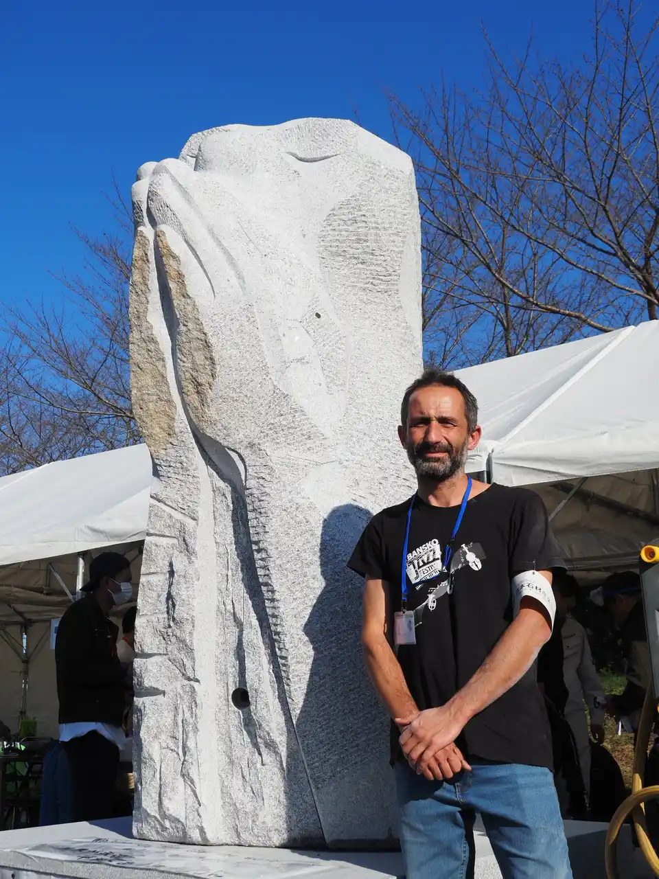 イヴァン・ストヤノフ氏はブルガリアを代表する石彫作家の一人です。2024年10月、茨城県桜川市に約1ヵ月滞在し、茨城県産の「やさとみかげ」を用いて本作品を制作しました。「やさとみかげ」は国際地質科学連合(IUGS)よりヘリテージストーン(世界天然石材遺産)に認定された筑波山塊の花崗岩で、日本を代表する石材の一つです。 |