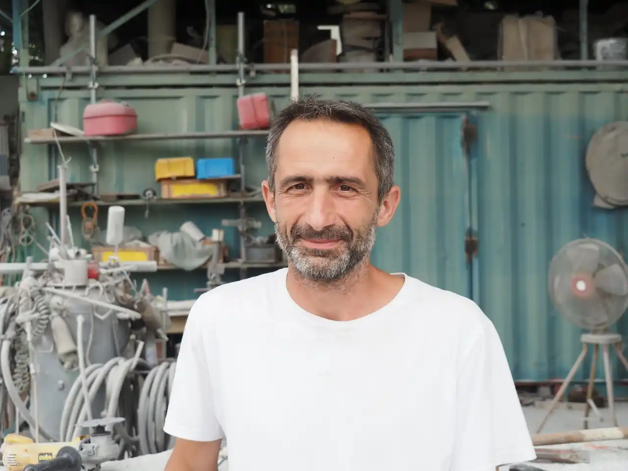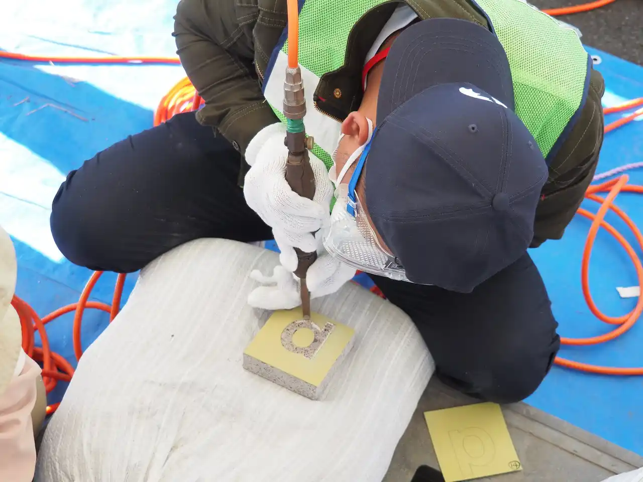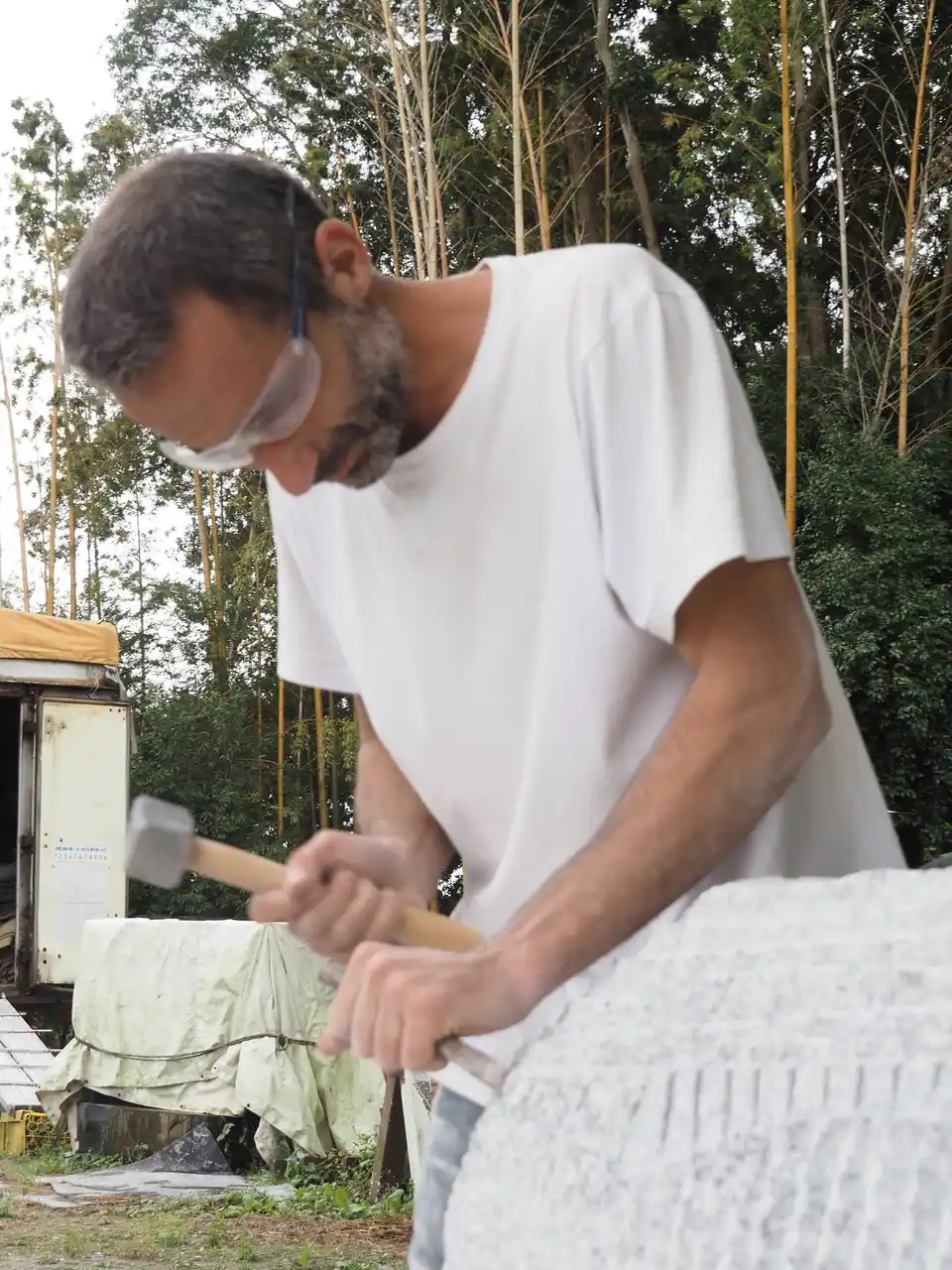 日本の石は初めてで花崗岩の手触りを確かめながら彫り進めます |