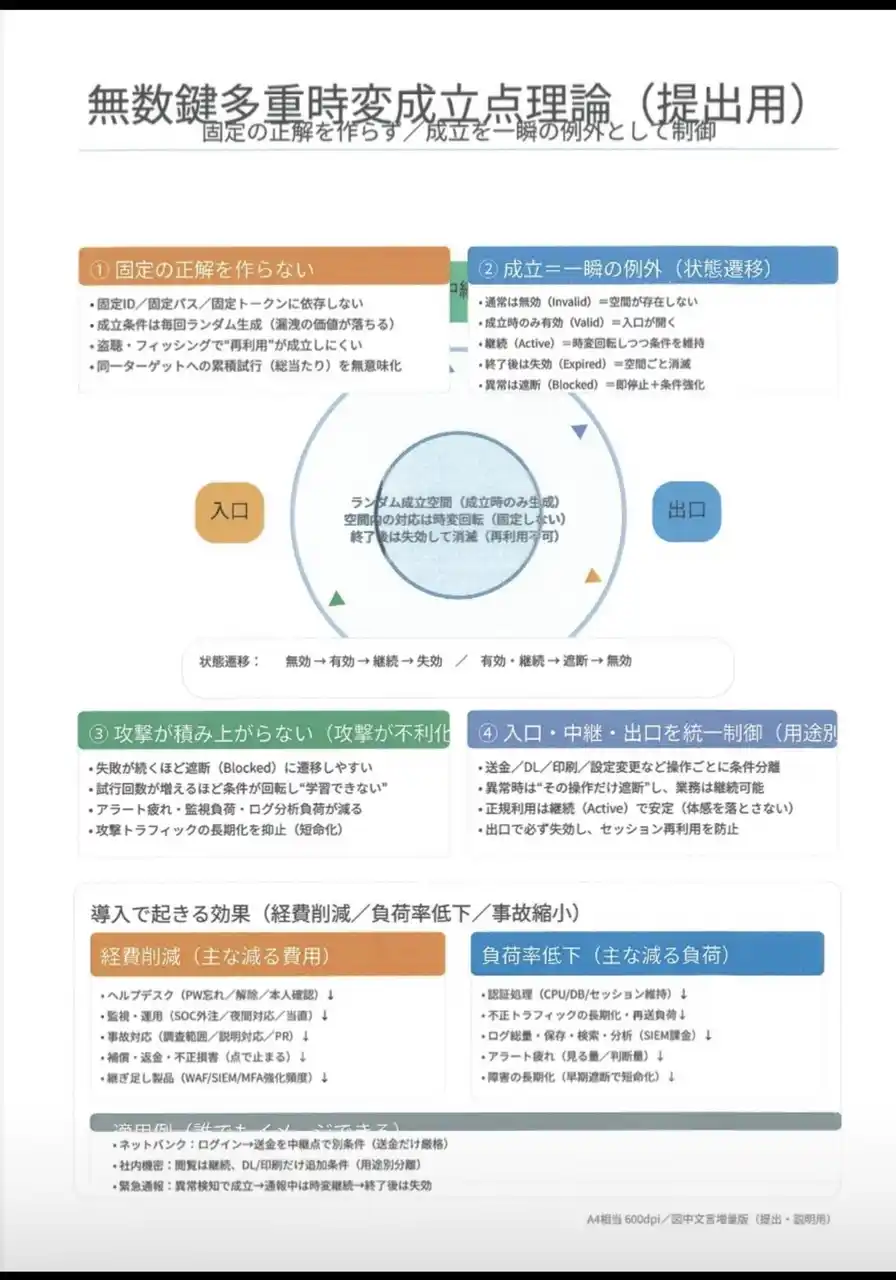 本技術は、暗号鍵を固定せず、多重高層構造による自動ウイルスチェックを経て安全が確認された場合のみ操作を成立させることで、従来の「認証突破後の被害化」を構造的に防止する新しいセキュリティ理論です。