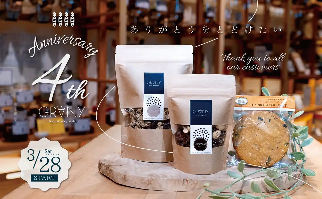 自然派グラノーラ専門バルクショップ【GRANY(グラニー)栄マルエイガレリア店】(grany-shop.com)は、日頃のご愛顧への感謝を込めて、2026年3月28日(土)から3月31日(火)の4日間、「GRANY 4周年祭」を開催します。期間中はガラポン抽選会や周年限定セットの販売、新ラインナップの先行販売など、4周年を記念した特別企画を実施します。 |