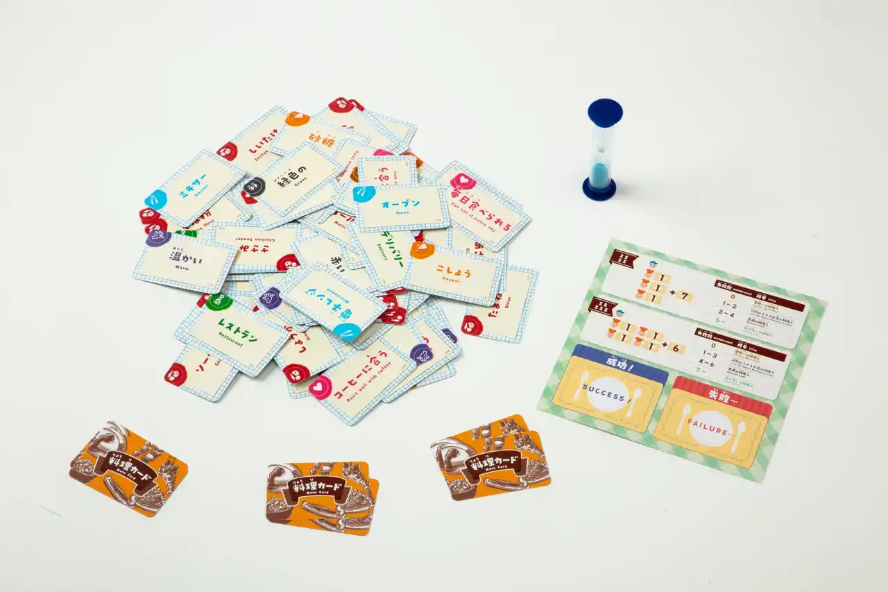 | 1.食材カードをテーブルに広げ、砂時計を用意します。1人がホール役、残りの全員がキッチン役となります。 | |||||||||