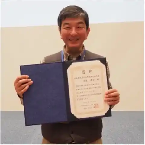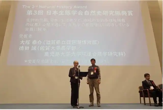 日本生態学会自然史研究振興賞を受賞した大塚泰介総括学芸員と授賞式の様子 |