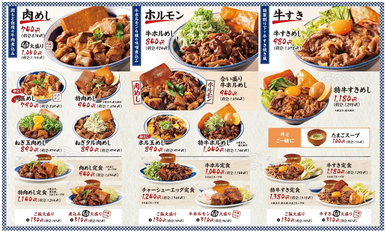 | 看板メニュー「肉めし」をはじめ、味噌で煮込んだ牛ホルモン、特製割り下で仕上げた牛すきなど豊富なラインナップを展開。 | |||