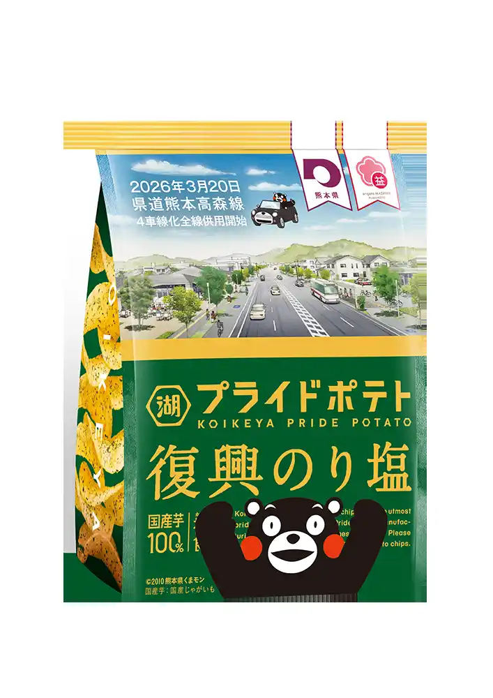 | 株式会社湖池屋(社長:佐藤章)は、2021年より熊本県益城町にて「湖池屋 九州阿蘇工場」を稼働しています。熊本県は2016年の熊本地震からの復興活動の一環として、主要道路である「県道 熊本高森線」の4車線化の工事を進めてきましたが、2026年3月20日に全線で供用が開始されました。震災後10年という節目のタイミングでもあることから、開通式が執り行われ、記念品として「湖池屋プライドポテト 復興のり塩」が参加者のみなさまに配布されました。 | |||
