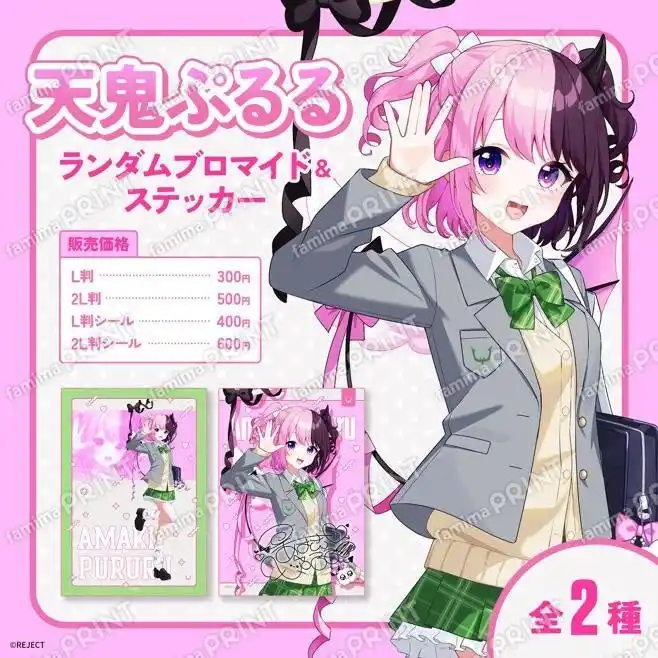 REJECT 人気Vtuber「天鬼ぷるる」の学生服イラストによる、限定ランダムブロマイド&ステッカーです。激レアとして本人サイン風箔押しデザインがランダムで排出されます。 |
