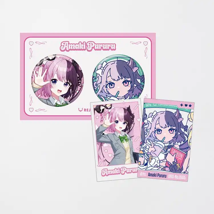 【内容】REJECT 人気Vtuber「天鬼ぷるる」のコラボ限定イラストが、チェキ風カードと缶バッジになったセットです。 |