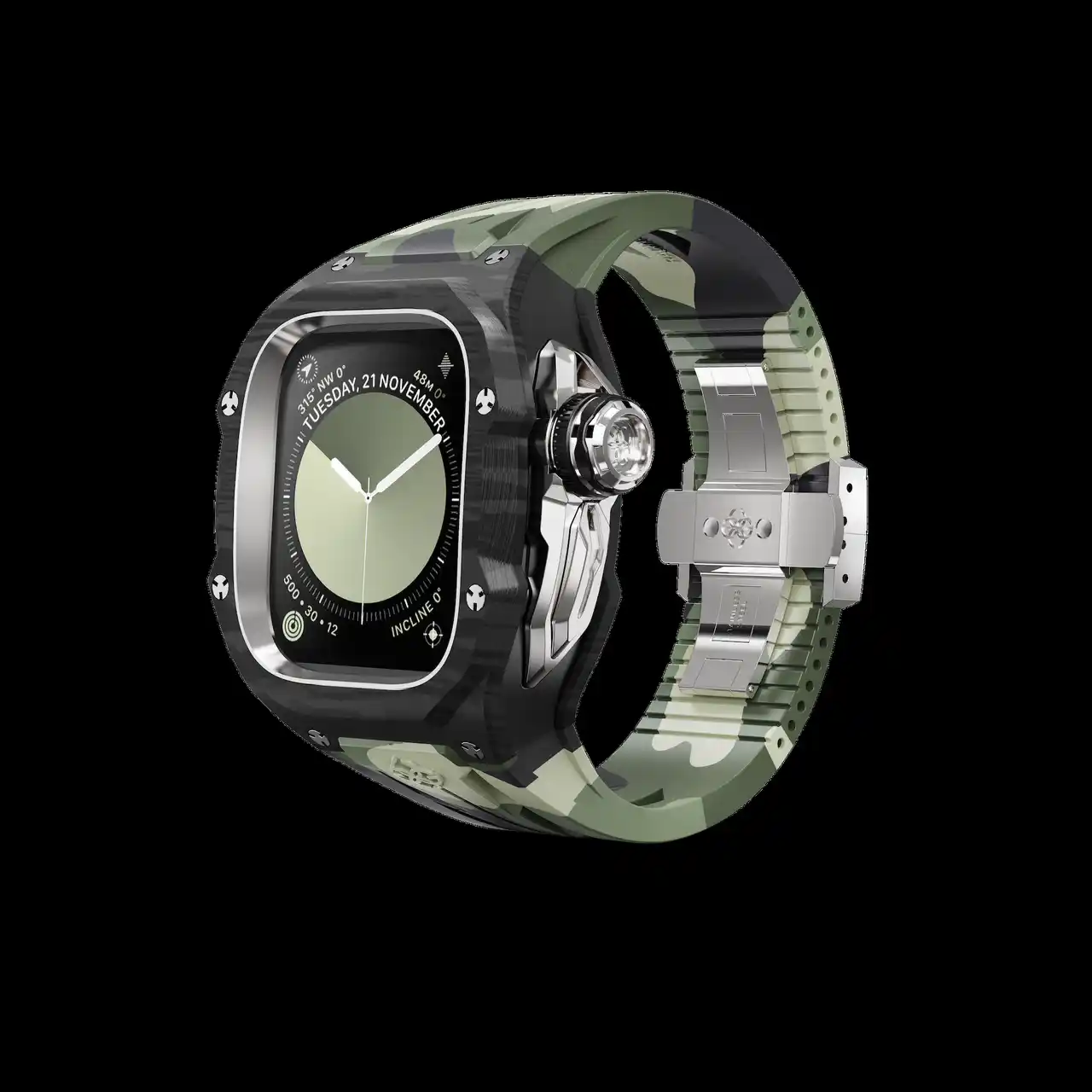 互換性:アップルウォッチULTRA1/2/3-49MM 素材:カーボンコンポジット × 316Lステンレススチール ケースサイズ:52,9 mm x 45,6 mm 防水:APPLE WATCHの防水性に準ずる ストラップ:ラバーストラップ、バタフライバックル 重量:160グラム (Apple Watch本体含まない 付属品:BOX、取り扱い説明書、専用ピン |