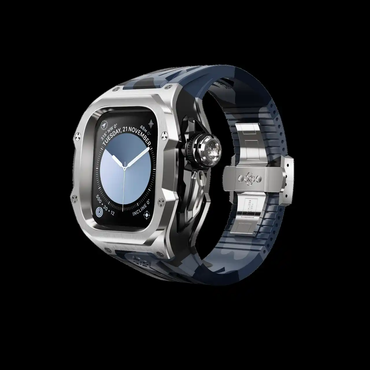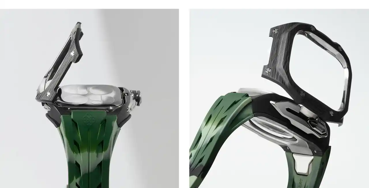 互換性:アップルウォッチ10 / 11 - 46MM 素材:カーボンコンポジット × 316Lステンレススチール ケースサイズ:52,9 mm x 45,6 mm 防水:APPLE WATCHの防水性に準ずる ストラップ:ラバーストラップ、バタフライバックル 重量:153グラム (Apple Watch本体含まない 付属品:BOX、取り扱い説明書、専用ピン |
