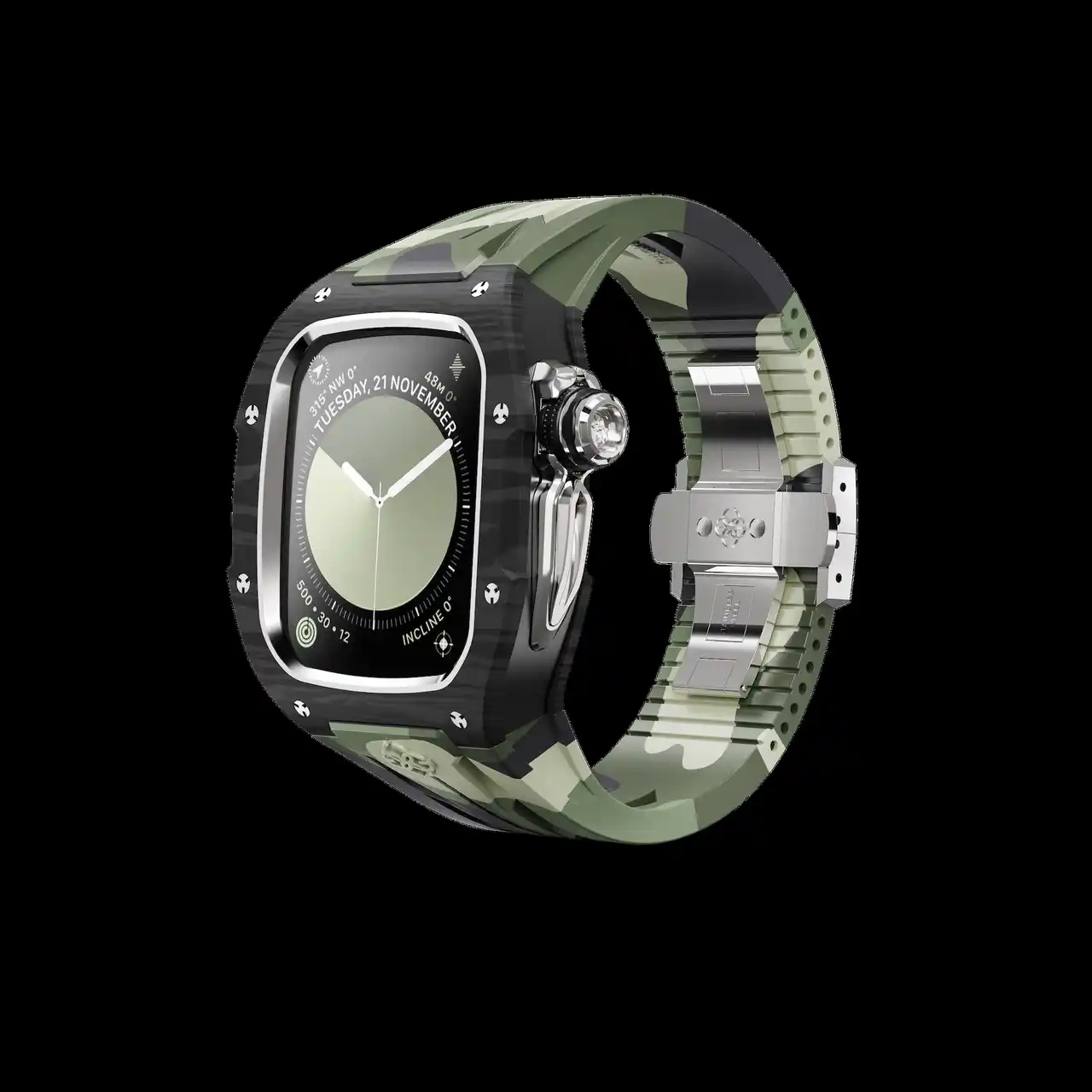 | グリーンやブルーにブラックを重ねたカモフラージュが、奥行きのある表情を生み出し、腕元に印象的な存在感をもたらします。スポーティな印象を持ちながら、日常使いしやすい配色に仕上げています。このカモフラージュパターンをストラップに取り入れることで、シンプルなケースとのバランスが取れたデザインとなっています。 | |||||||||
