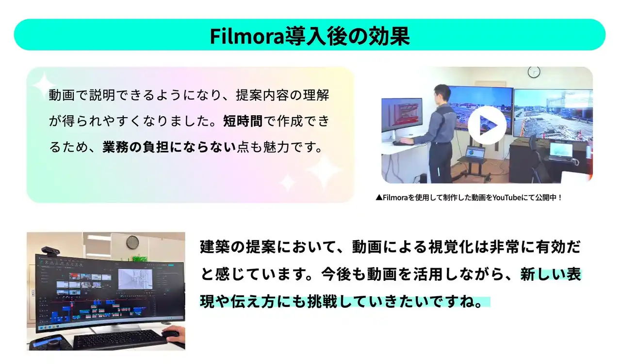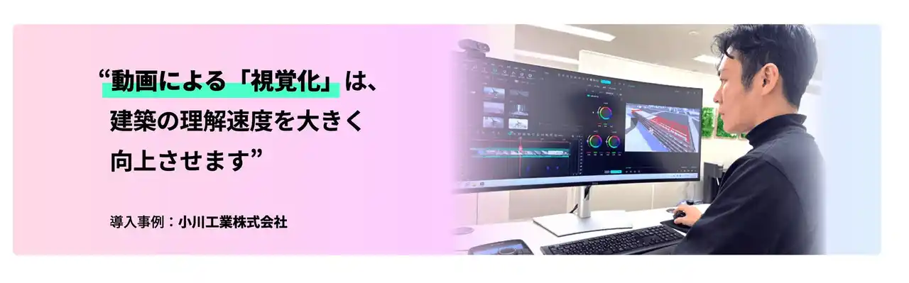 導入後は、動画による視覚的なプレゼンテーションが可能になったことで、施主の理解度が向上。短時間で高品質な動画を内製できるため、迅速な合意形成と担当者の業務負担軽減を両立させています。 |