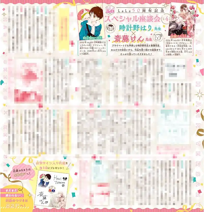 カラー記事:LaLa50周年記念スペシャル座談会!第4弾「時計野はり×斎藤けん」 |
