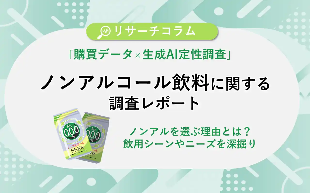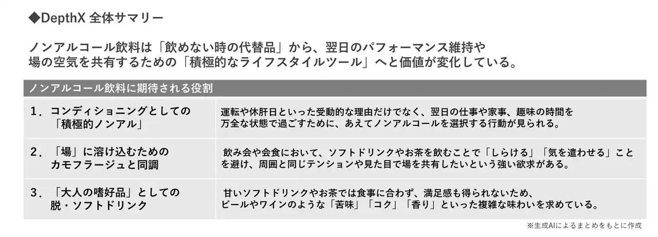 今回は、若年層を中心としたアルコール離れやソバーキュリアス(お酒を飲める人が、あえて飲まないライフスタイル)の定着により関心が高まっている「ノンアルコール飲料」に着目し、「デプスル」を用いた調査を実施しました。ノンアルコール飲料の飲用実態や利用シーンを調査対象とし、データだけでは見えない生活者のニーズやインサイトを明らかにしています。 |