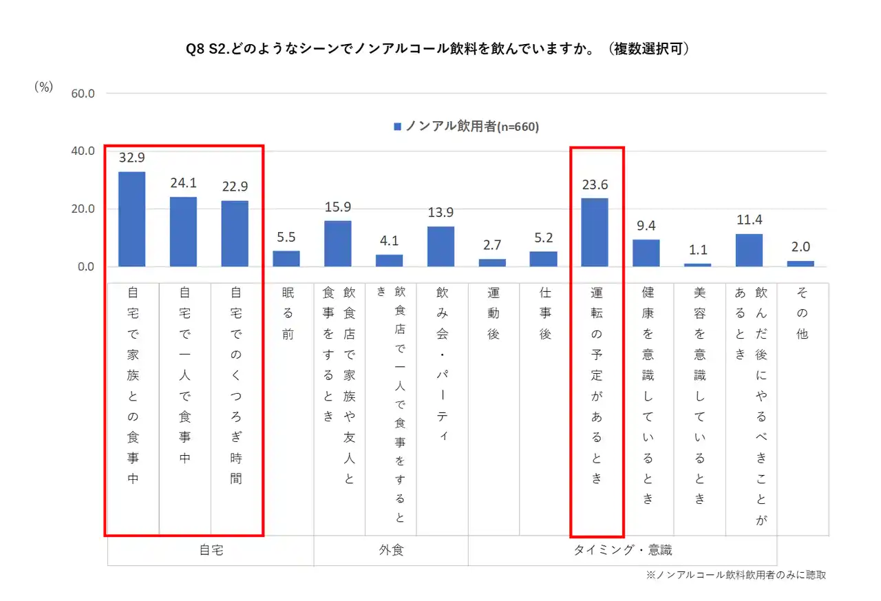 いずれの場合でも、ソフトドリンクとは明確に区別してノンアルコール飲料を選択している様子がうかがえました。 |