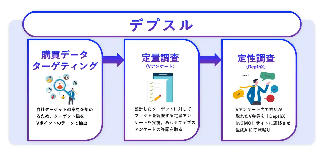 「新商品開発を進めたいが、従来のアンケートでは顧客のニーズが見えない」「インタビュー調査には時間とコストがかかる」といった課題を耳にすることがあります。そこで、近年はAIを活用したデプスインタビューが注目されています。「デプスル」では、V会員 約1.3億人(有効ID数)の購買データを活用し、特定商品購入者や競合商品利用者に対して、定量調査と生成AIを組み合わせたデプスリサーチが可能であり、ユーザーに確実にアプローチできます。さらに、多大な時間とコストがかかっていたデプスインタビューとは異なり、実査開始から8営業日程度でサマリーまで納品可能です。 |