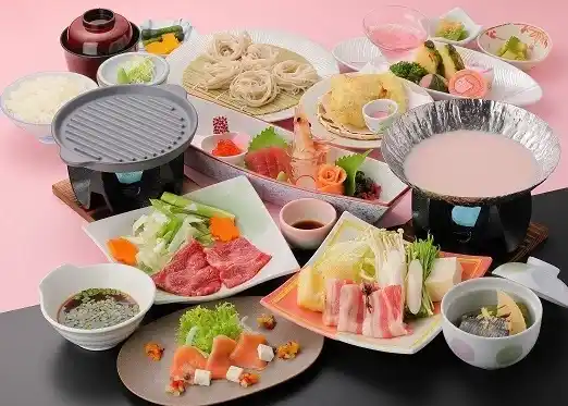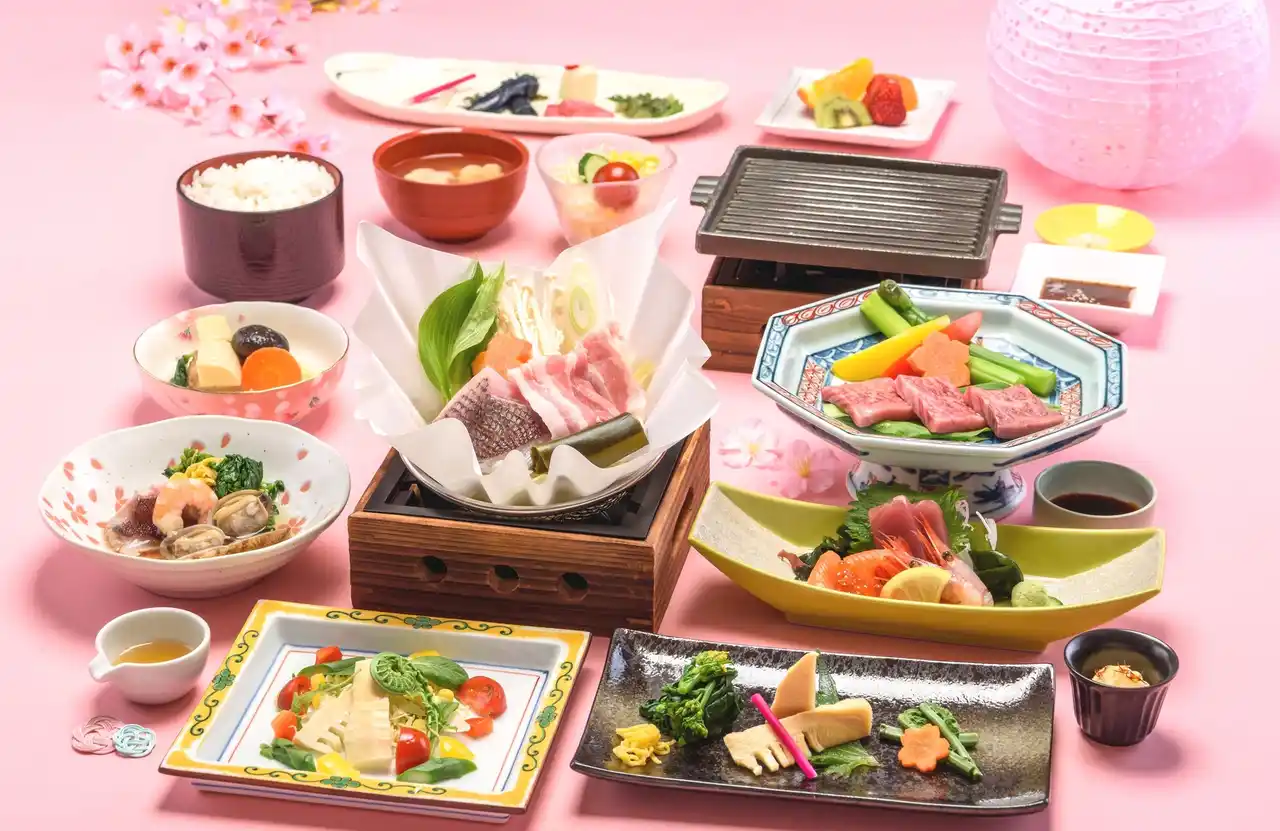 道産牛の焼しゃぶや桜豆乳鍋、山菜の天ぷらなど北海道の春の味覚を楽しむ会席料理です。 |