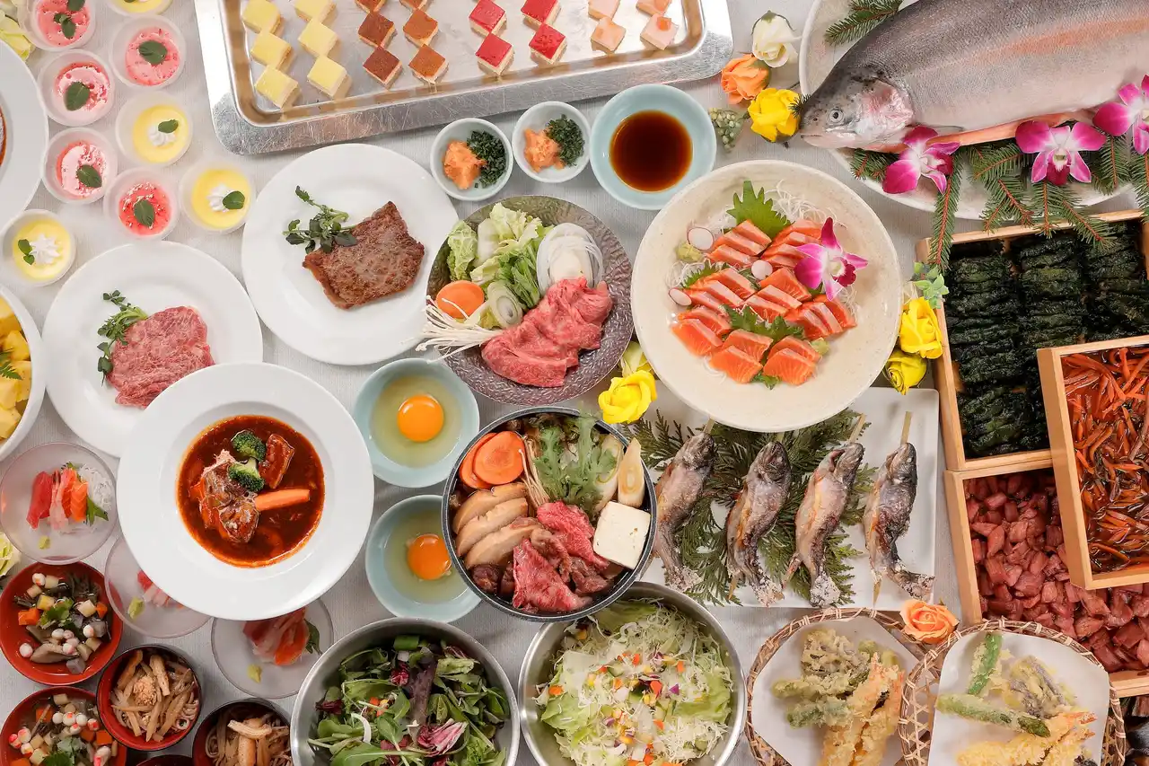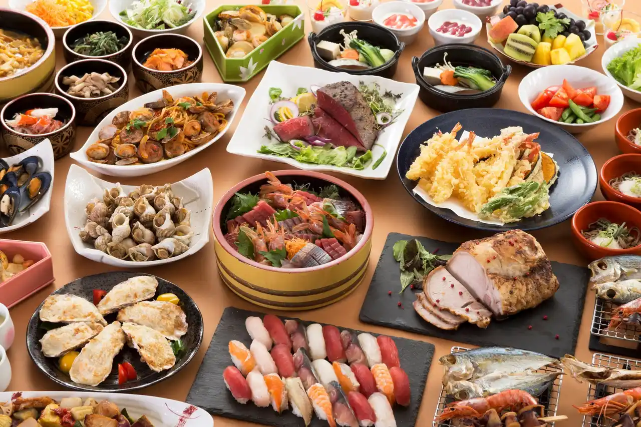 握り寿司やステーキなどライブキッチンの出来たて料理に加えひっつみ汁や盛岡三大麺など郷土の味覚を楽しめるビュッフェ。 |